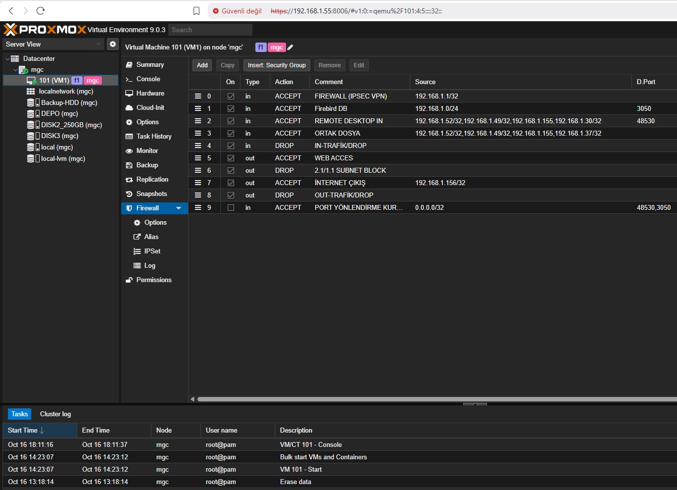 - Entegre PVE Firewall: Protokol, port ve makro bazlı kurallar tanımlanabilir. bknz:https://pve.proxmox.com/wiki/Firewall